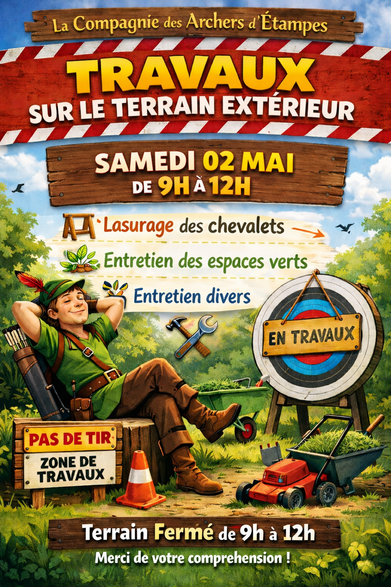Pas besoin d’être un grand bricoleur pour venir donner un coup de main, lasurage de la ciblerie, travaux d'évacuation des déchets de ciblerie et de pierres, élagage et petits travaux divers au programme, donc bienvenu à tous avec votre matériel si vous en avez, brouette, tronçonneuse, tondeuse, visseuse, scie, ...., et bienvenue si des pros (avec leur matériel) sont parmi les Archers ou leurs parents.